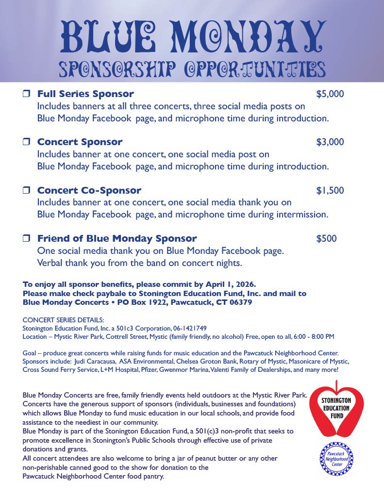 Thank you to our loyal sponsors- ASA Environmental Products, Judi Caracausa, Rotary Club of Mystic, Dt Logos, Mark Briggs, Chelsea Groton Bank, Sound Portfolio Advisors, Sound Waves, 85th Day Food Community, Savage Sound, CMB Creative Group and Mystic River Park.